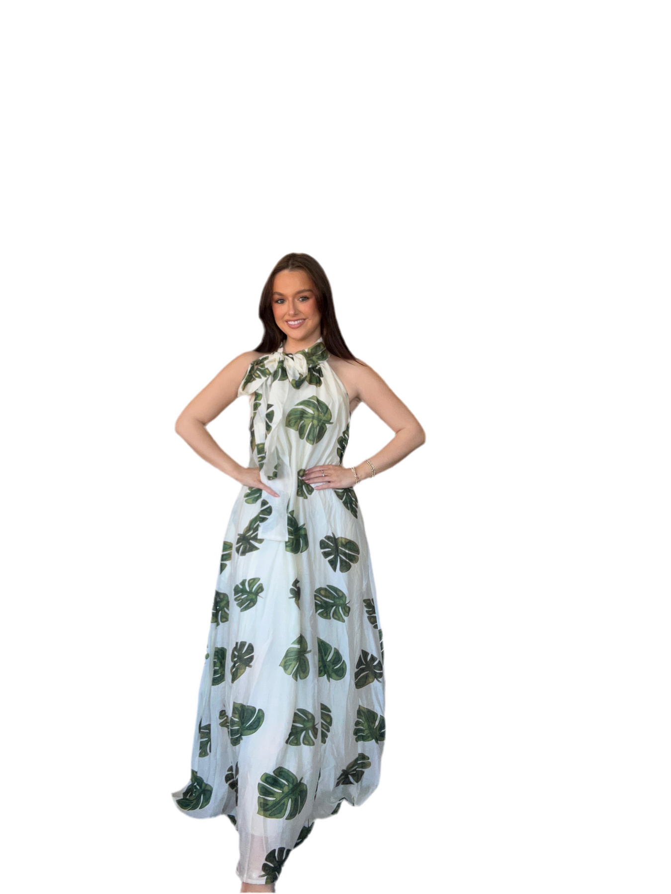 Cream Leaf Print Maxi Dress with Halter Tie Neck | Entro Boutique Dress