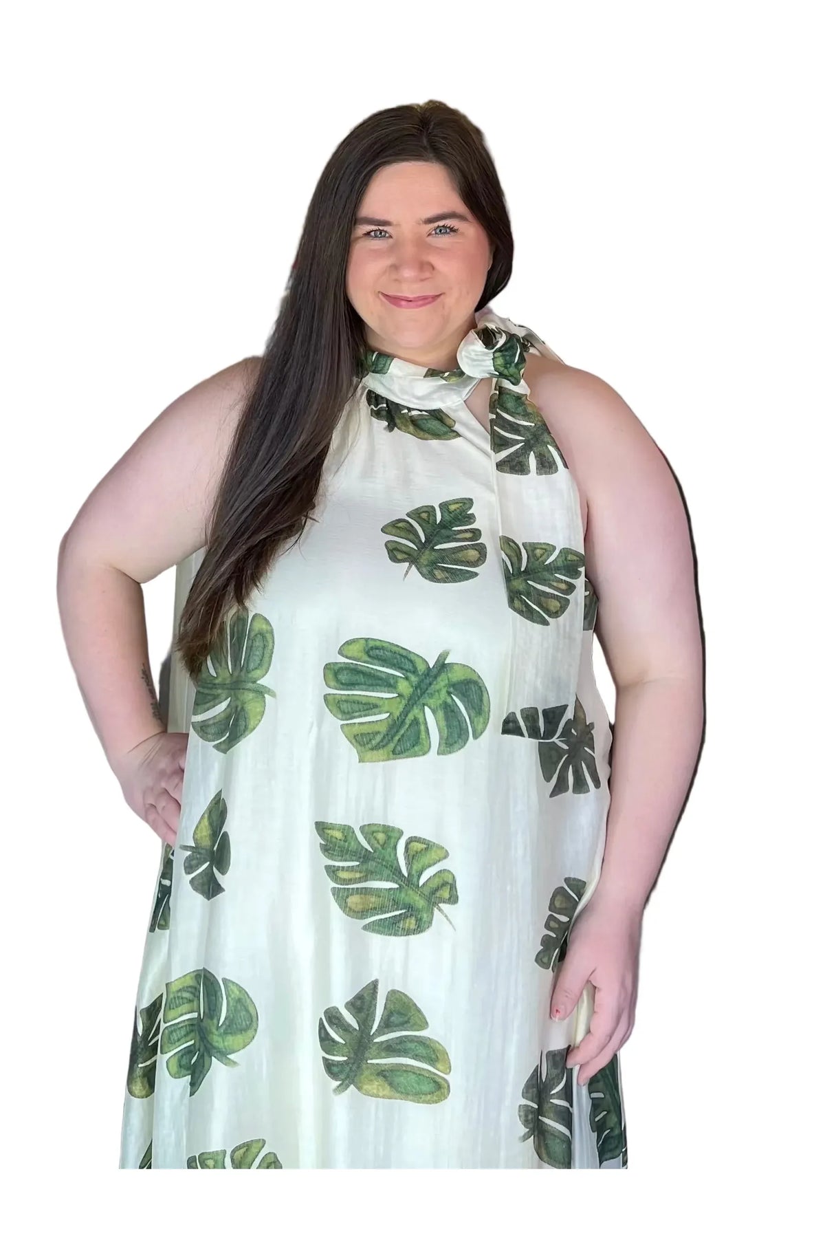 Cream Leaf Print Maxi Dress with Halter Tie Neck | Entro Boutique Dress